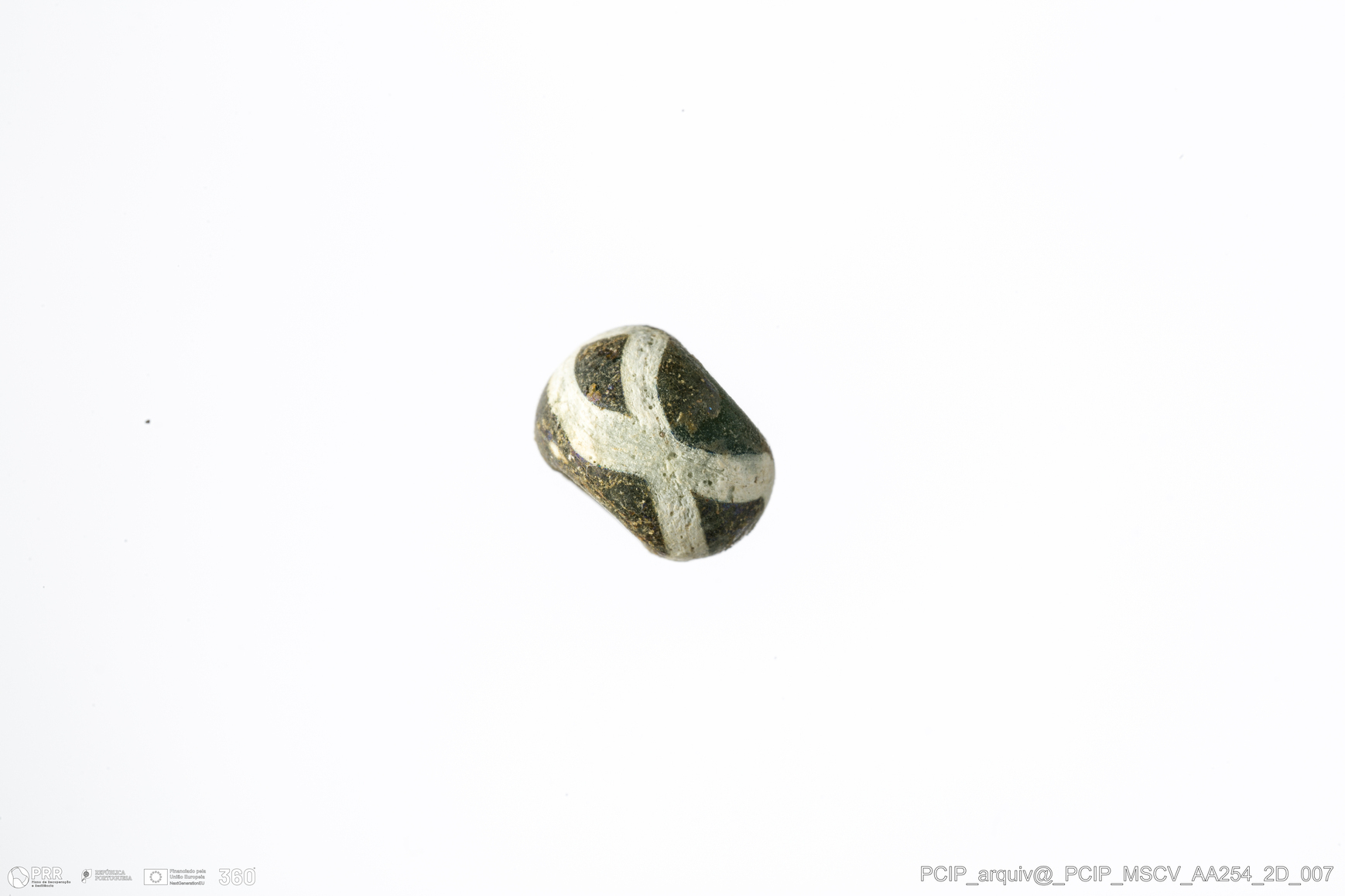 Matéria/Técnica: Vidro; Cronologia: Século XVI-Século XVII; Autoria: Desconhecida; Dimensões: Altura: 4,5mm; Diâmetro: 6,5mm.