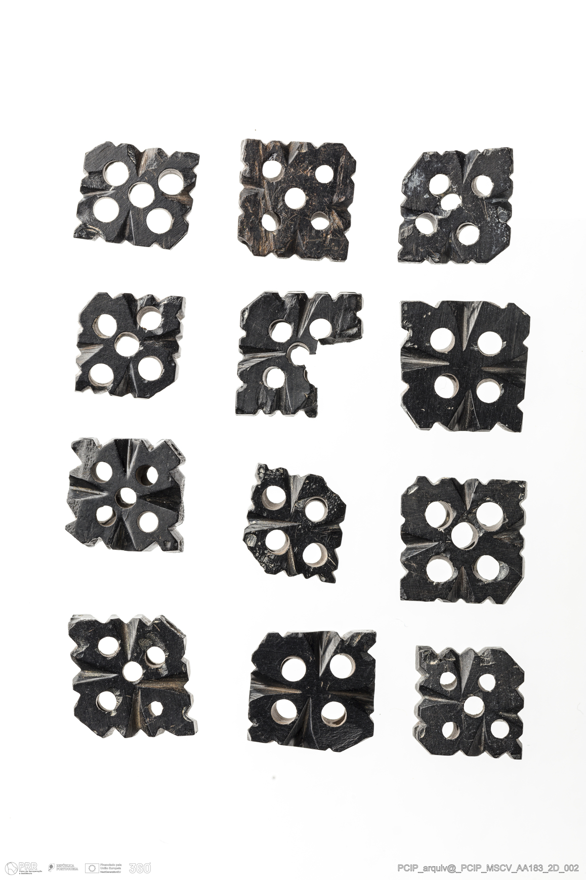 Matéria/Técnica: Azeviche; Cronologia: Século XVI-Século XVII; Autoria: Desconhecida; Dimensões: Medidas da conta inteira maior: Comprimento: 13,5mm; Largura: 13,5mm; Espessura: 4mm.
