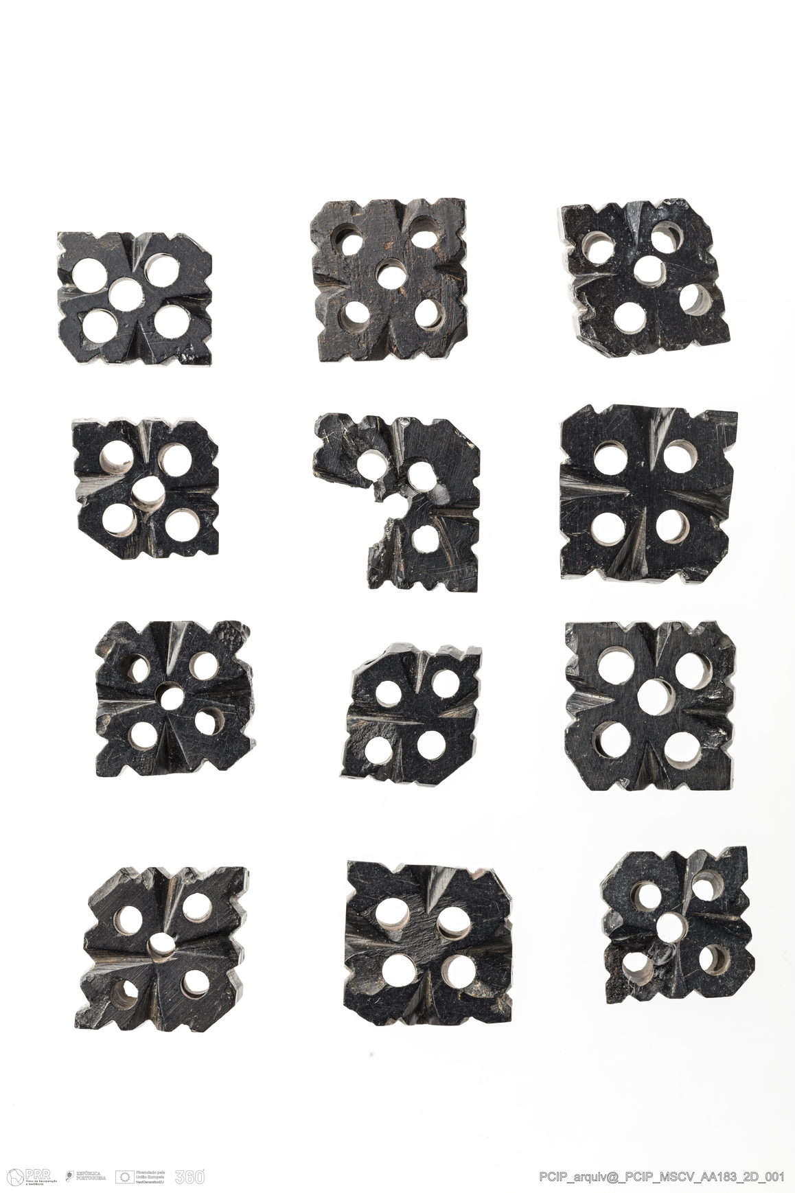 Matéria/Técnica: Azeviche; Cronologia: Século XVI-Século XVII; Autoria: Desconhecida; Dimensões: Medidas da conta inteira maior: Comprimento: 13,5mm; Largura: 13,5mm; Espessura: 4mm.