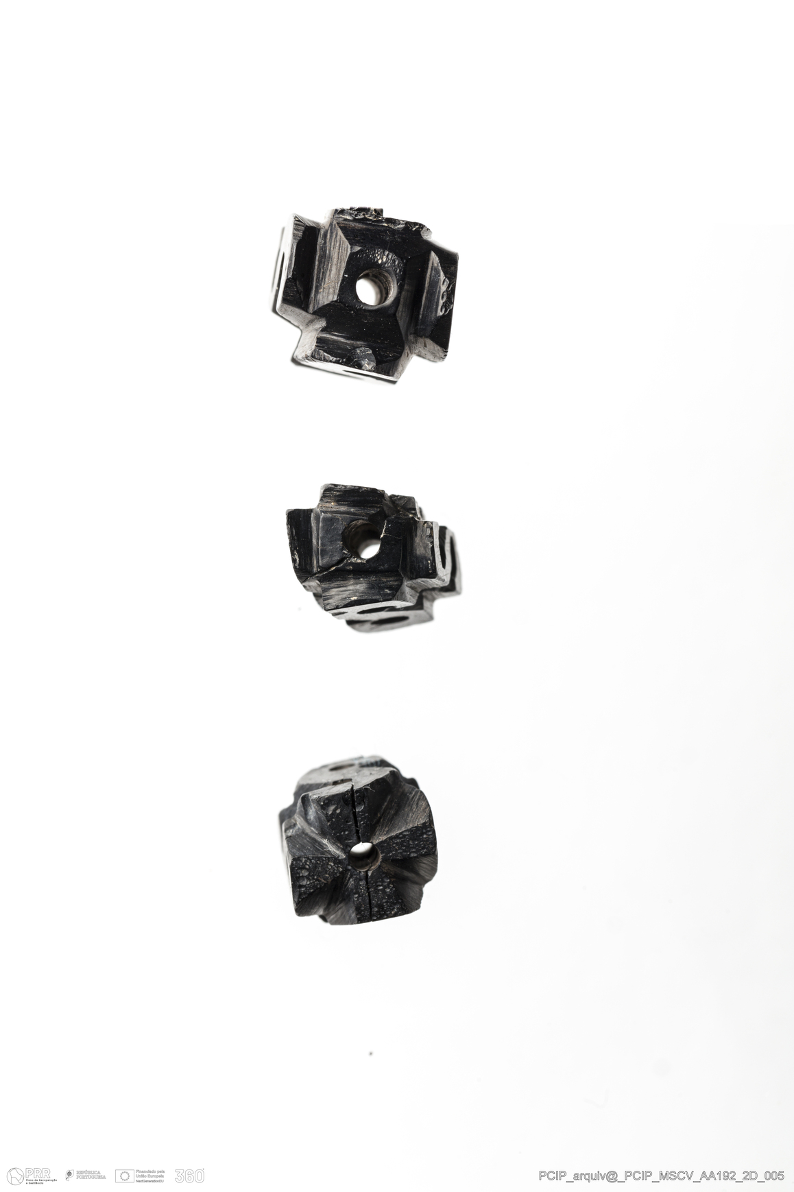 Matéria/Técnica: Azeviche; Cronologia: Século XVI-Século XVII; Autoria: Desconhecida; Dimensões: Medidas conta inteira maior: Comprimento: 15mm; Largura: 9mm; Espessura: 10mm.