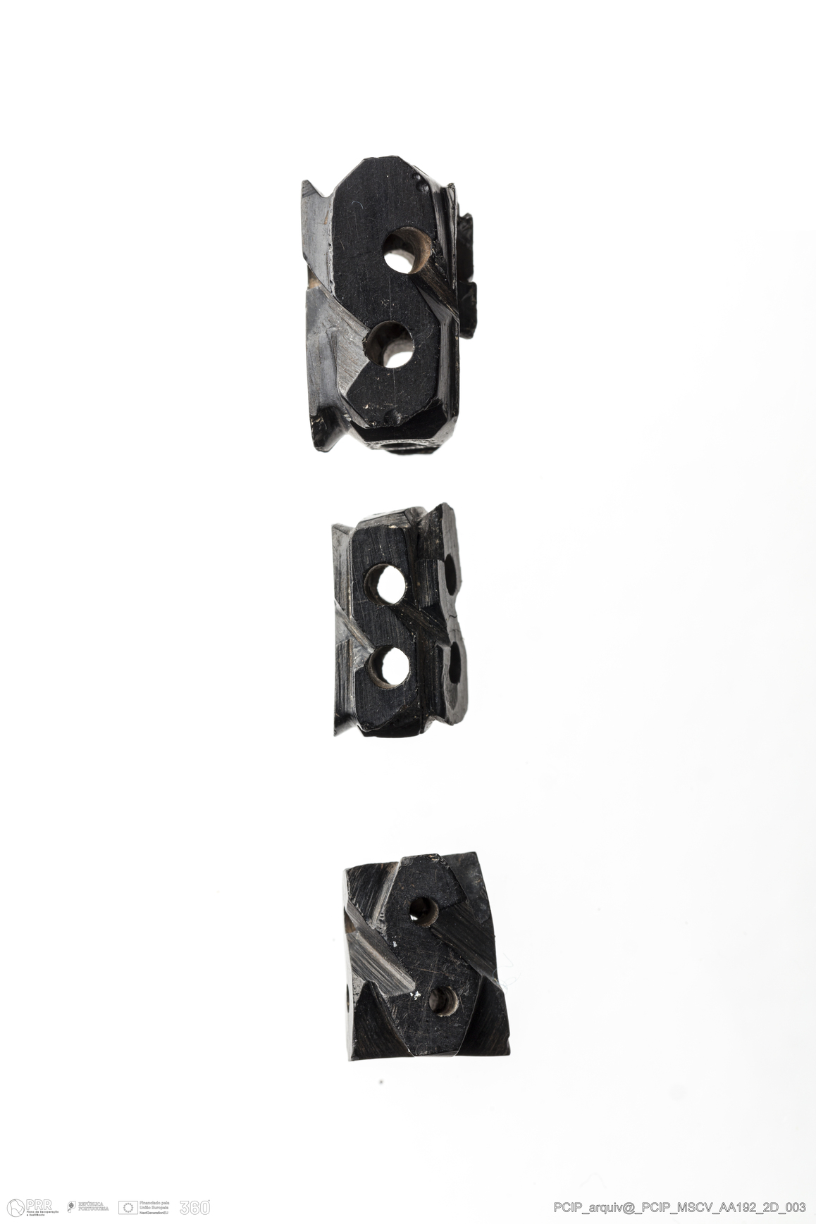 Matéria/Técnica: Azeviche; Cronologia: Século XVI-Século XVII; Autoria: Desconhecida; Dimensões: Medidas conta inteira maior: Comprimento: 15mm; Largura: 9mm; Espessura: 10mm.
