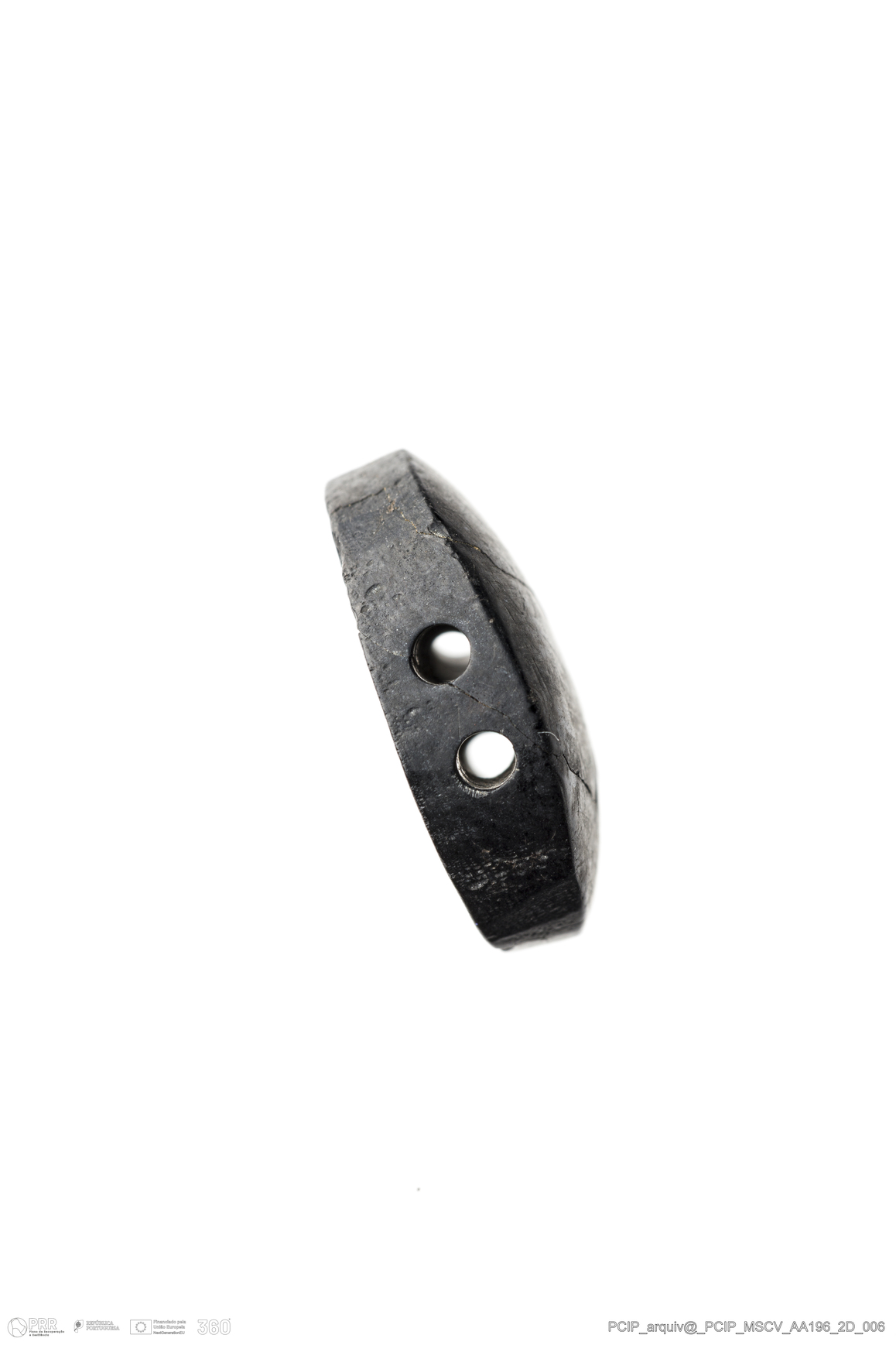Matéria/Técnica: Azeviche; Cronologia: Século XVI-Século XVII; Autoria: Desconhecida; Dimensões: Medidas conta inteira maior: Comprimento: 18mm; Largura: 15mm; Espessura: 4,5mm.