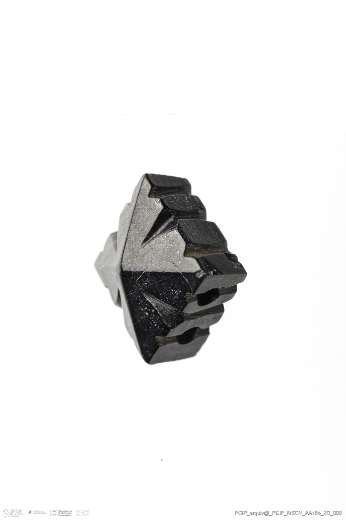 Matéria/Técnica: Azeviche; Cronologia: Século XVI-Século XVII; Autoria: Desconhecida; Dimensões: Medidas conta inteira maior: Comprimento: 11mm; Espessura: 7mm.