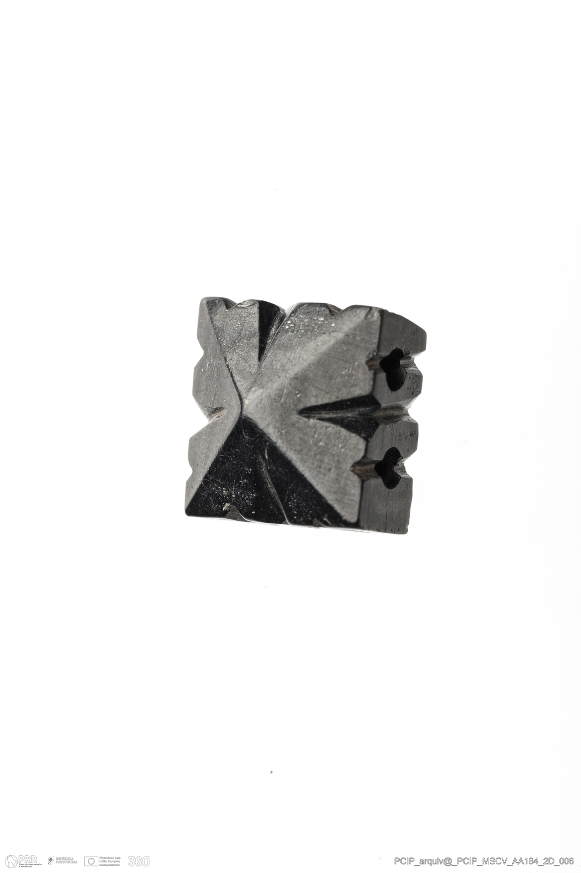 Matéria/Técnica: Azeviche; Cronologia: Século XVI-Século XVII; Autoria: Desconhecida; Dimensões: Medidas conta inteira maior: Comprimento: 11mm; Espessura: 7mm.