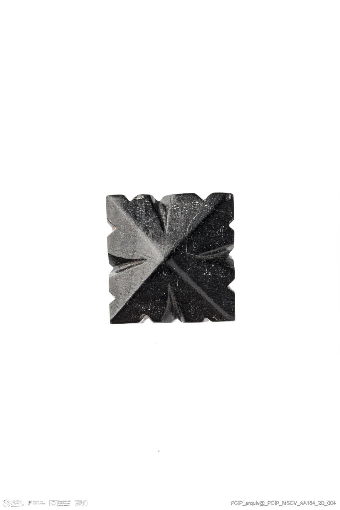 Matéria/Técnica: Azeviche; Cronologia: Século XVI-Século XVII; Autoria: Desconhecida; Dimensões: Medidas conta inteira maior: Comprimento: 11mm; Espessura: 7mm.
