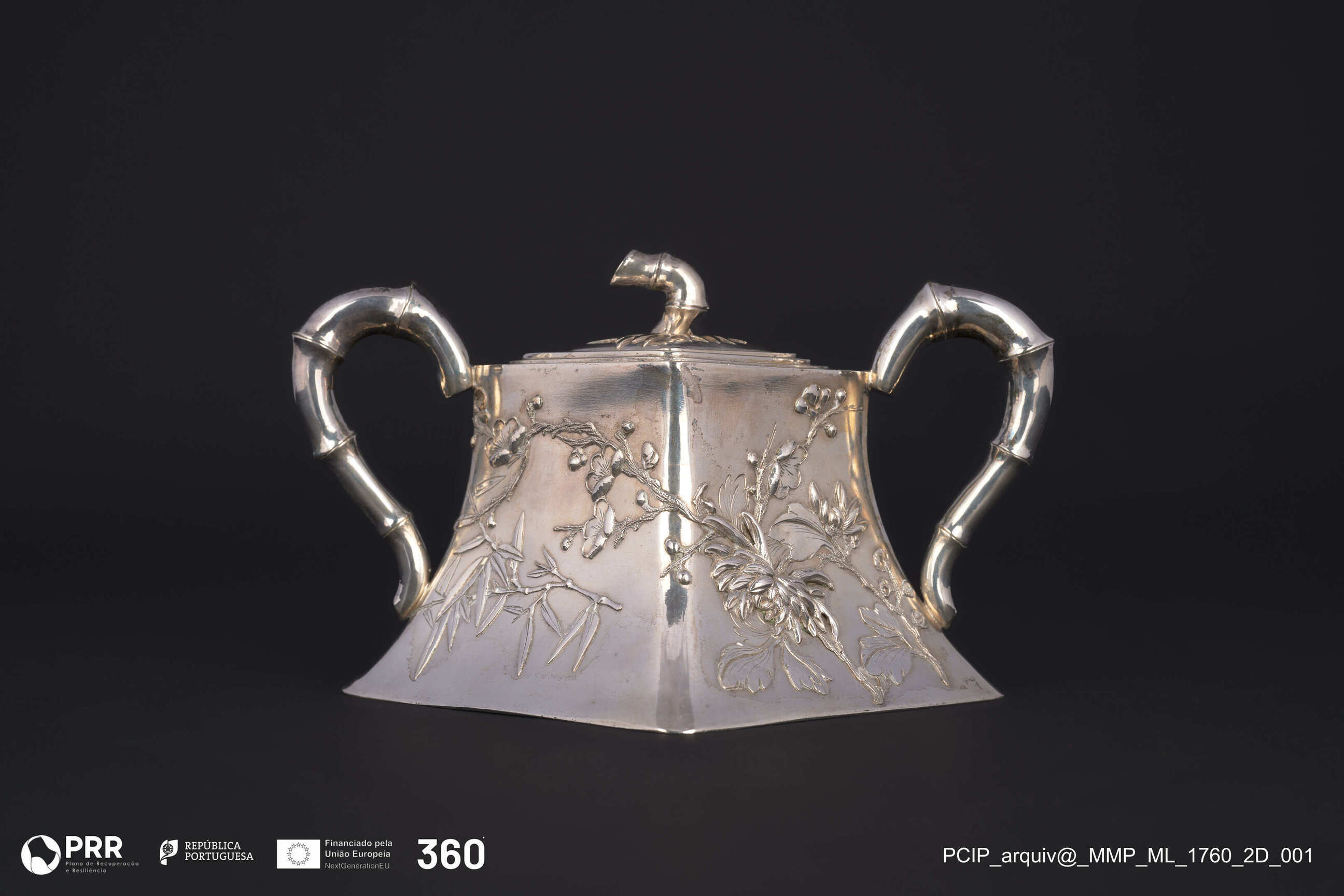 Matéria/Técnica: Prata fundida, cinzelada e dourada.; Cronologia: 1895-1905; Autoria: Wo Kwong; Dimensões (cm): Altura: 9,7 x Comprimento: 16.