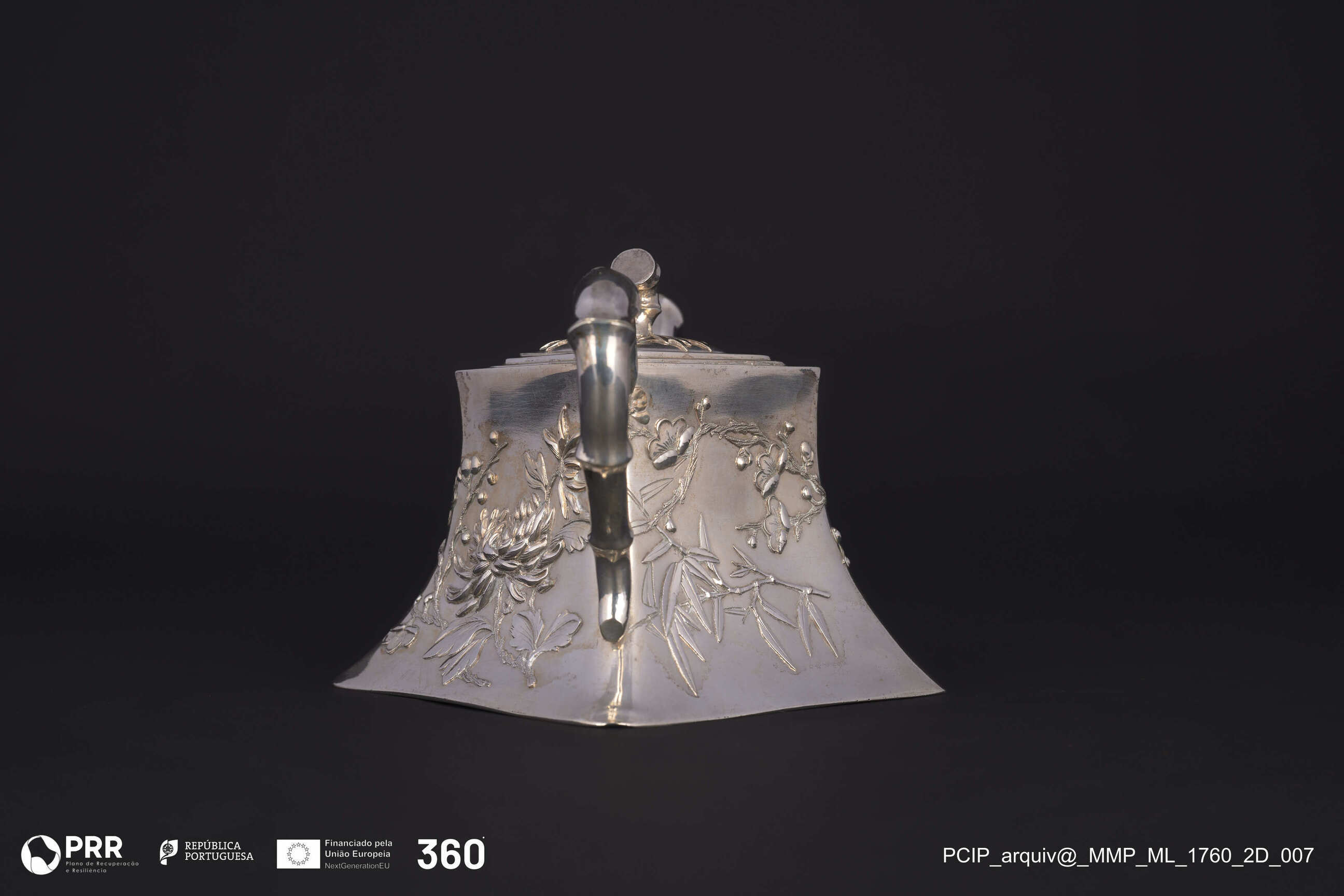 Matéria/Técnica: Prata fundida, cinzelada e dourada.; Cronologia: 1895-1905; Autoria: Wo Kwong; Dimensões (cm): Altura: 9,7 x Comprimento: 16.