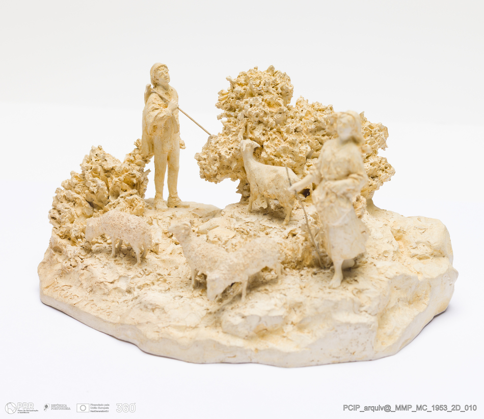 Matéria/Técnica: Barro branco modelado; Cronologia: 1932; Autoria: Francisco Elias / Caldas da Rainha, Portugal; Dimensões (cm): Altura: 7,5; Largura: 14,5; Comprimento: 8.