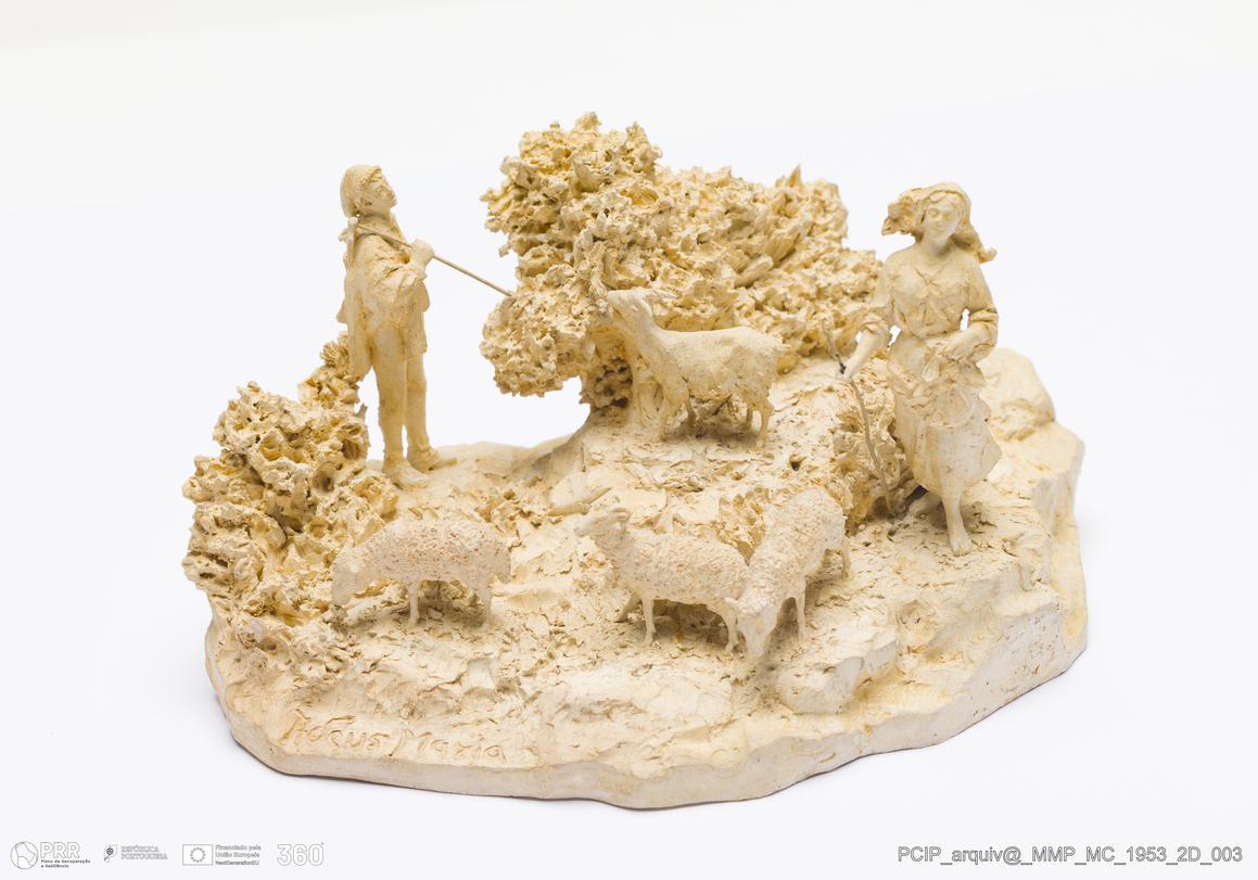 Matéria/Técnica: Barro branco modelado; Cronologia: 1932; Autoria: Francisco Elias / Caldas da Rainha, Portugal; Dimensões (cm): Altura: 7,5; Largura: 14,5; Comprimento: 8.