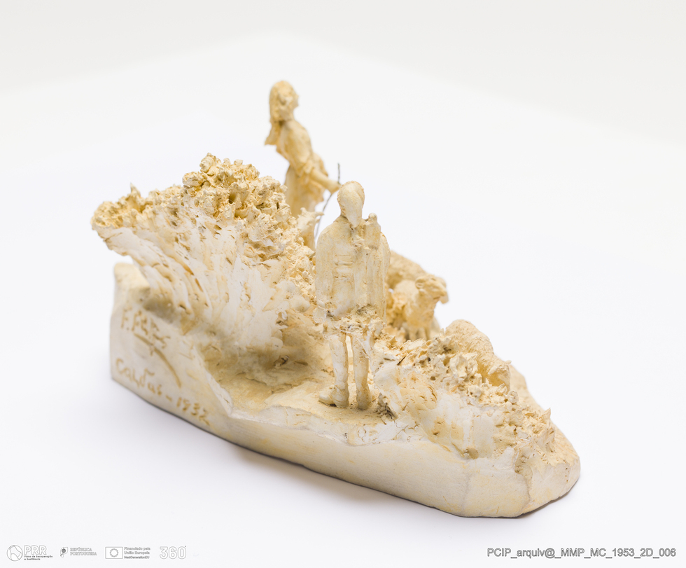 Matéria/Técnica: Barro branco modelado; Cronologia: 1932; Autoria: Francisco Elias / Caldas da Rainha, Portugal; Dimensões (cm): Altura: 7,5; Largura: 14,5; Comprimento: 8.