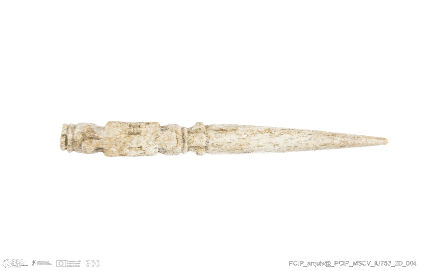 Matéria/Técnica: Osso; Cronologia: Século XVII; Autoria: Desconhecida; Dimensões: Comprimento: 67mm; Largura: 10mm; Espessura: 7mm.