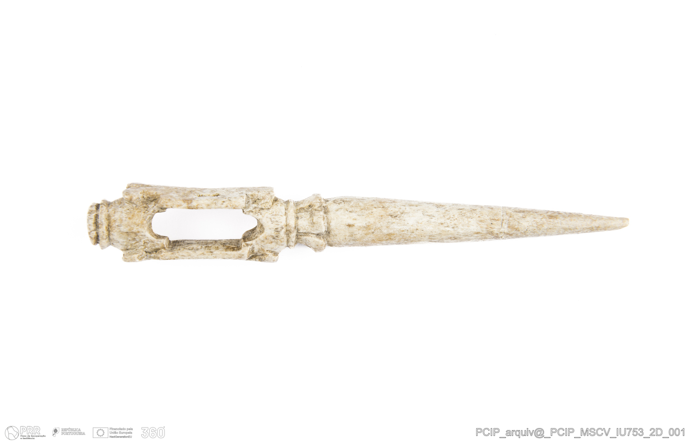 Matéria/Técnica: Osso; Cronologia: Século XVII; Autoria: Desconhecida; Dimensões: Comprimento: 67mm; Largura: 10mm; Espessura: 7mm.