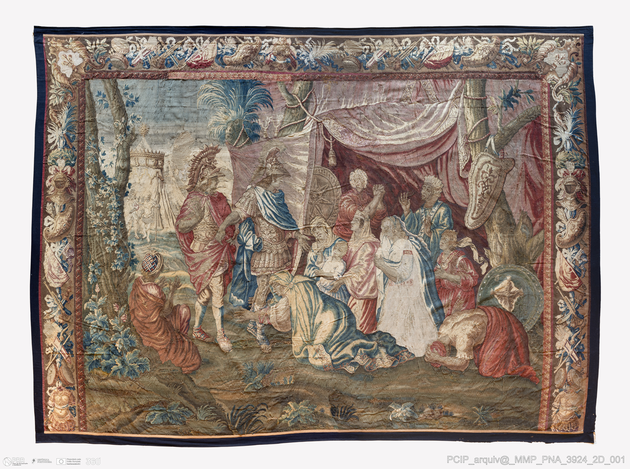 Matéria/Técnica: Tapeçaria de liço; Cronologia: Século XVIII; Autoria: Jeaucour, Michel; Dimensões: Altura: 330,5 cm x Largura: 464 cm.