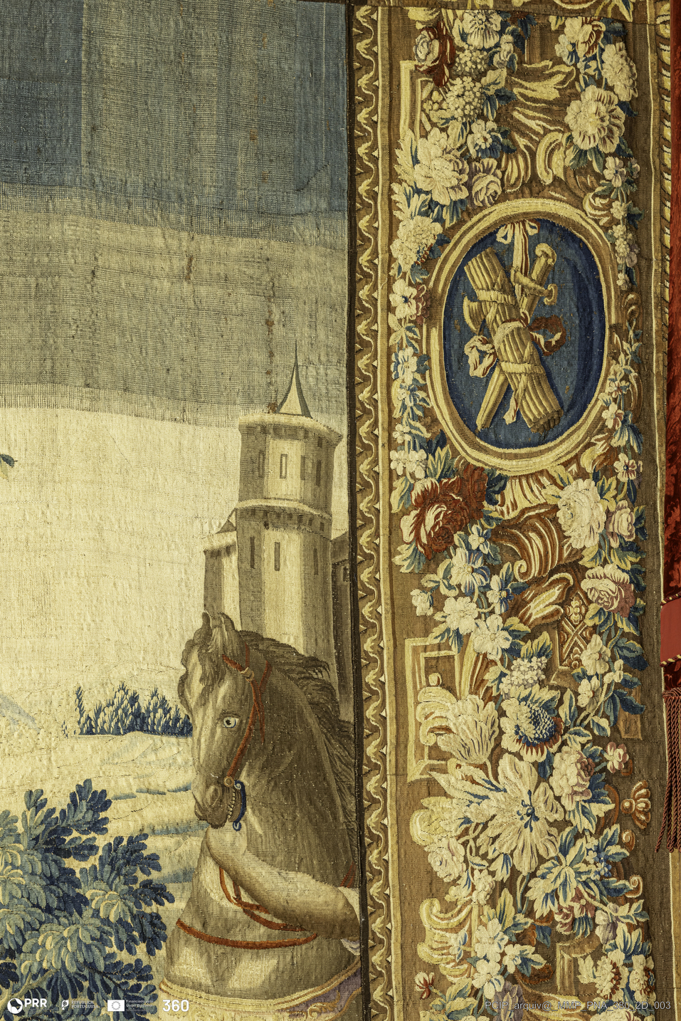 Matéria/Técnica: Tapeçaria de liço; Cronologia: Século XVIII; Autoria: Desconhecida; Dimensões: Altura: 467 cm x Largura: 307 cm.