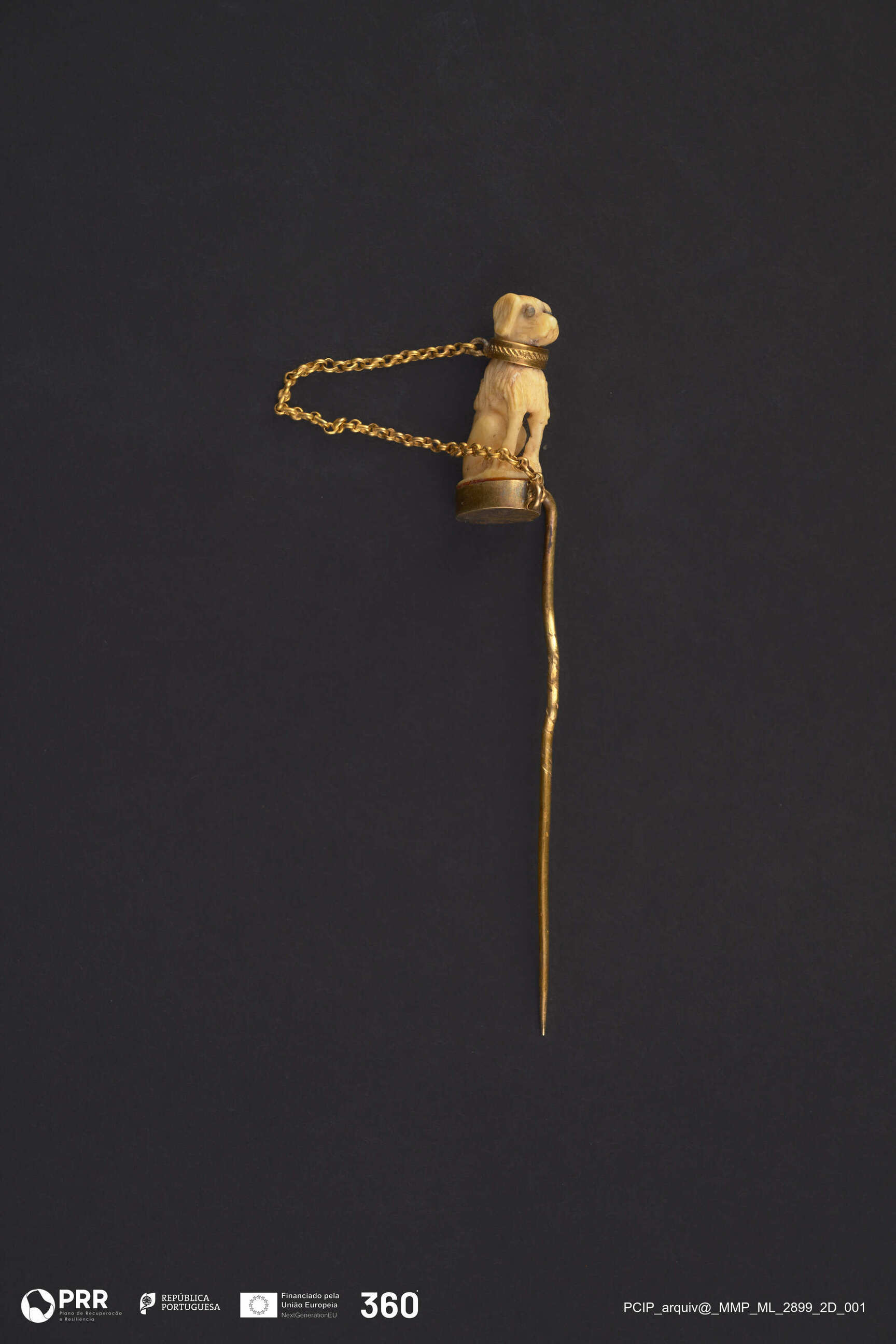 Matéria/Técnica: Eboraria e ouro relevado e cinzelado; Cronologia: 1851-1897; Autoria: Silva, António da (Joalheiro); Dimensões (cm): Altura: 7.