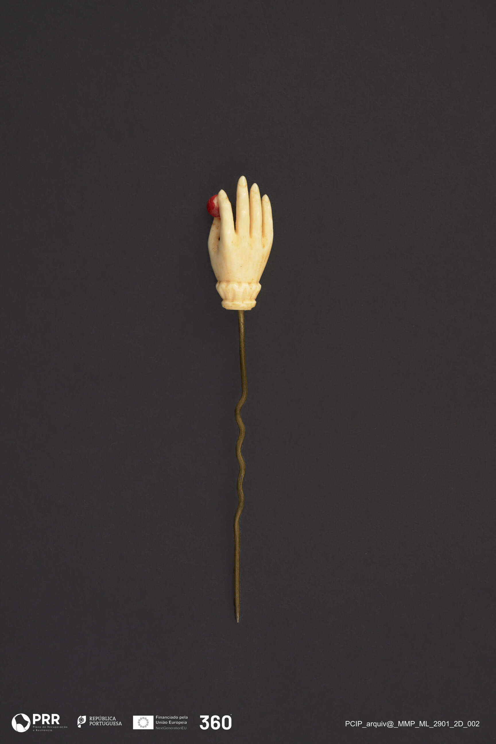 Matéria/Técnica: Eboraria; Cronologia: 1851-1897; Autoria: Silva, António da (Joalheiro); Dimensões (cm): Altura: 7,5 x Largura: 1 ( mão de marfim ).