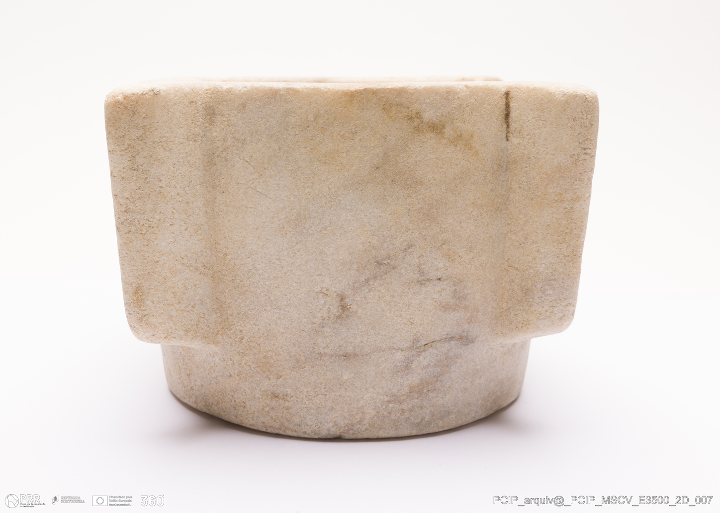Matéria/Técnica: Pedra; Cronologia: Século XVII; Autoria: Desconhecida; Dimensões: Altura: 125mm; Largura: 230mm; Diâmetro: 178mm; Diâmetro base: 152mm.