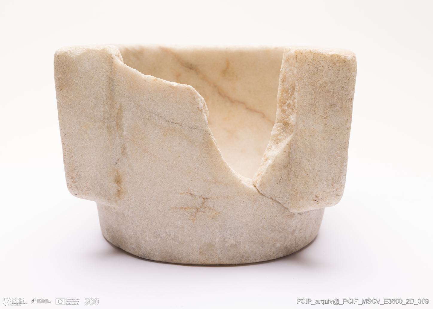 Matéria/Técnica: Pedra; Cronologia: Século XVII; Autoria: Desconhecida; Dimensões: Altura: 125mm; Largura: 230mm; Diâmetro: 178mm; Diâmetro base: 152mm.