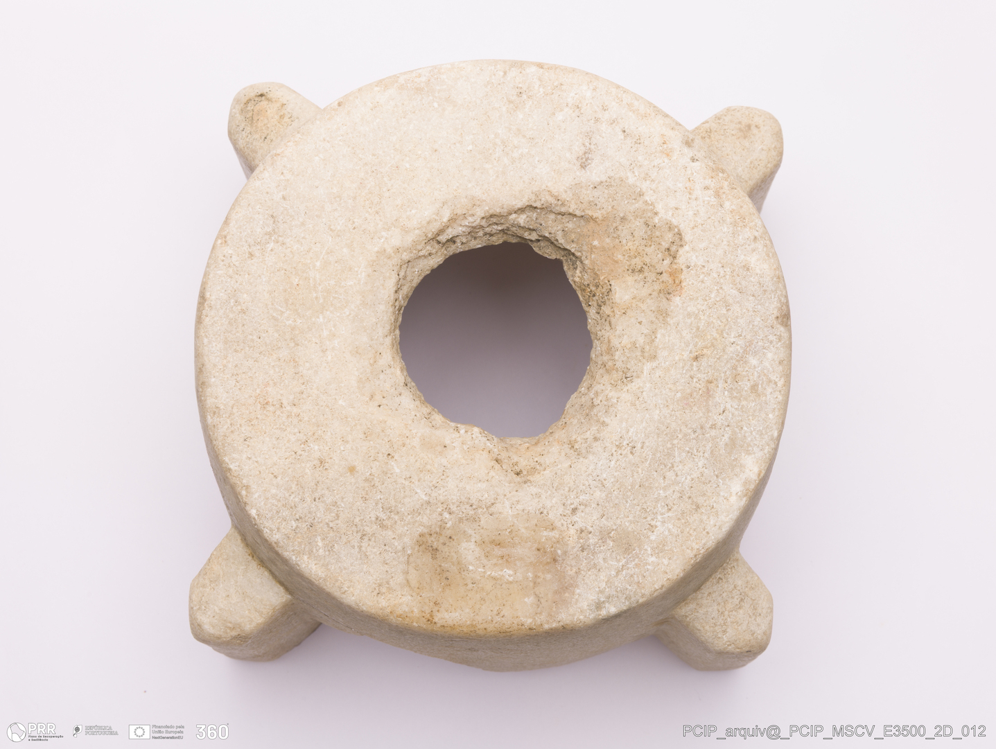 Matéria/Técnica: Pedra; Cronologia: Século XVII; Autoria: Desconhecida; Dimensões: Altura: 125mm; Largura: 230mm; Diâmetro: 178mm; Diâmetro base: 152mm.