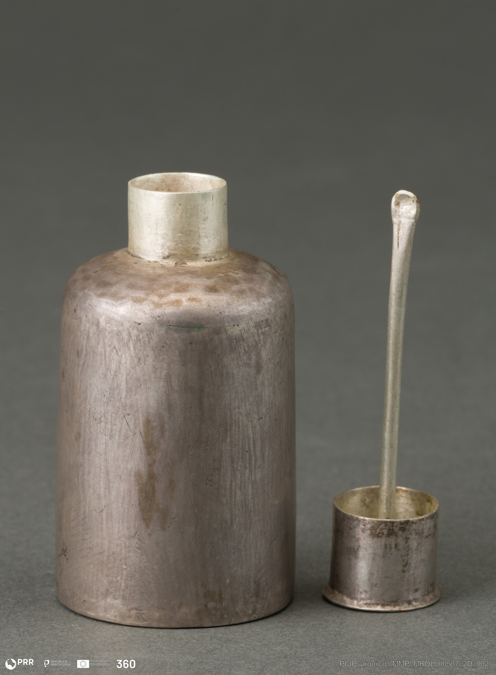 Matéria/Técnica: Prata; Cronologia: Desconhecida; Autoria: Desconhecida; Dimensões: Altura: 6,90 cm; Diâmetro: 3,71 cm; Peso: 52,00 gr.