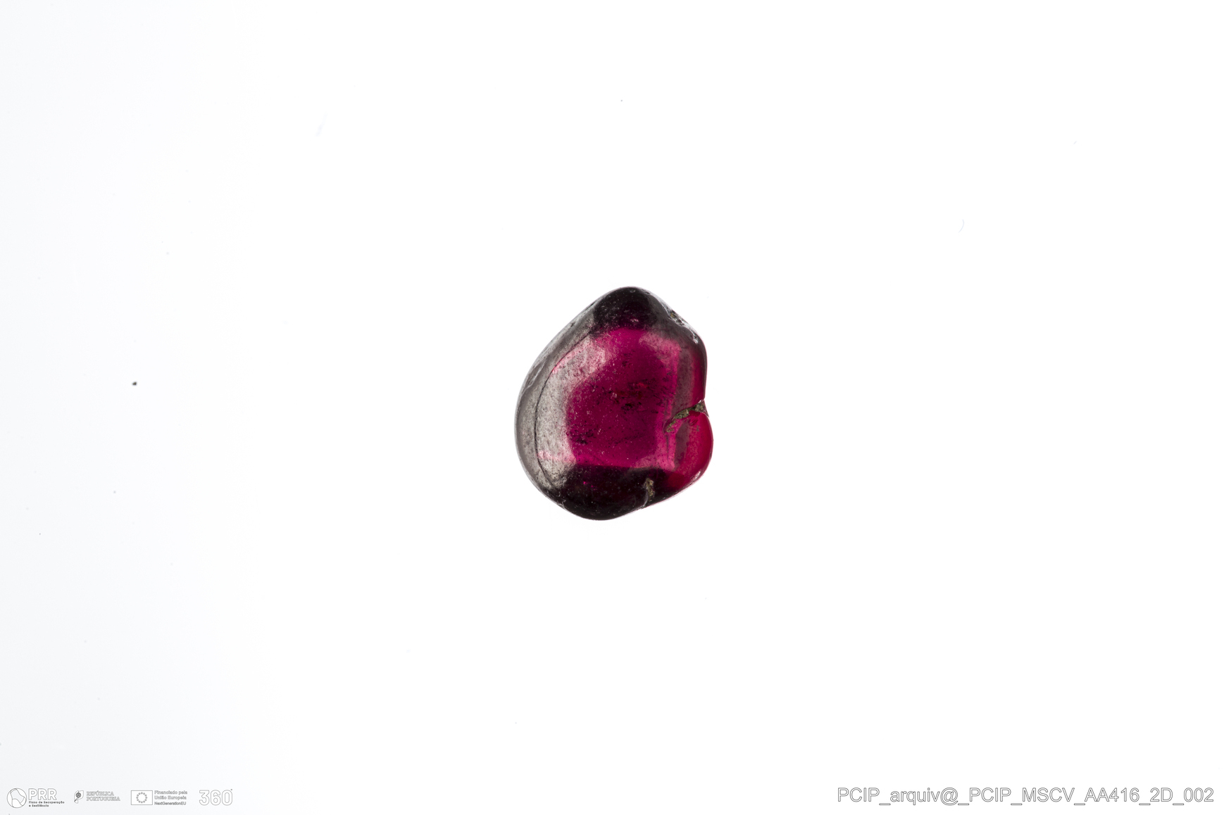 Matéria/Técnica: ametista (?); Cronologia: Século XVI- XVII; Autoria: Desconhecida; Dimensões: Comprimento: 7mm; Largura: 6mm; Espessura: 4mm.