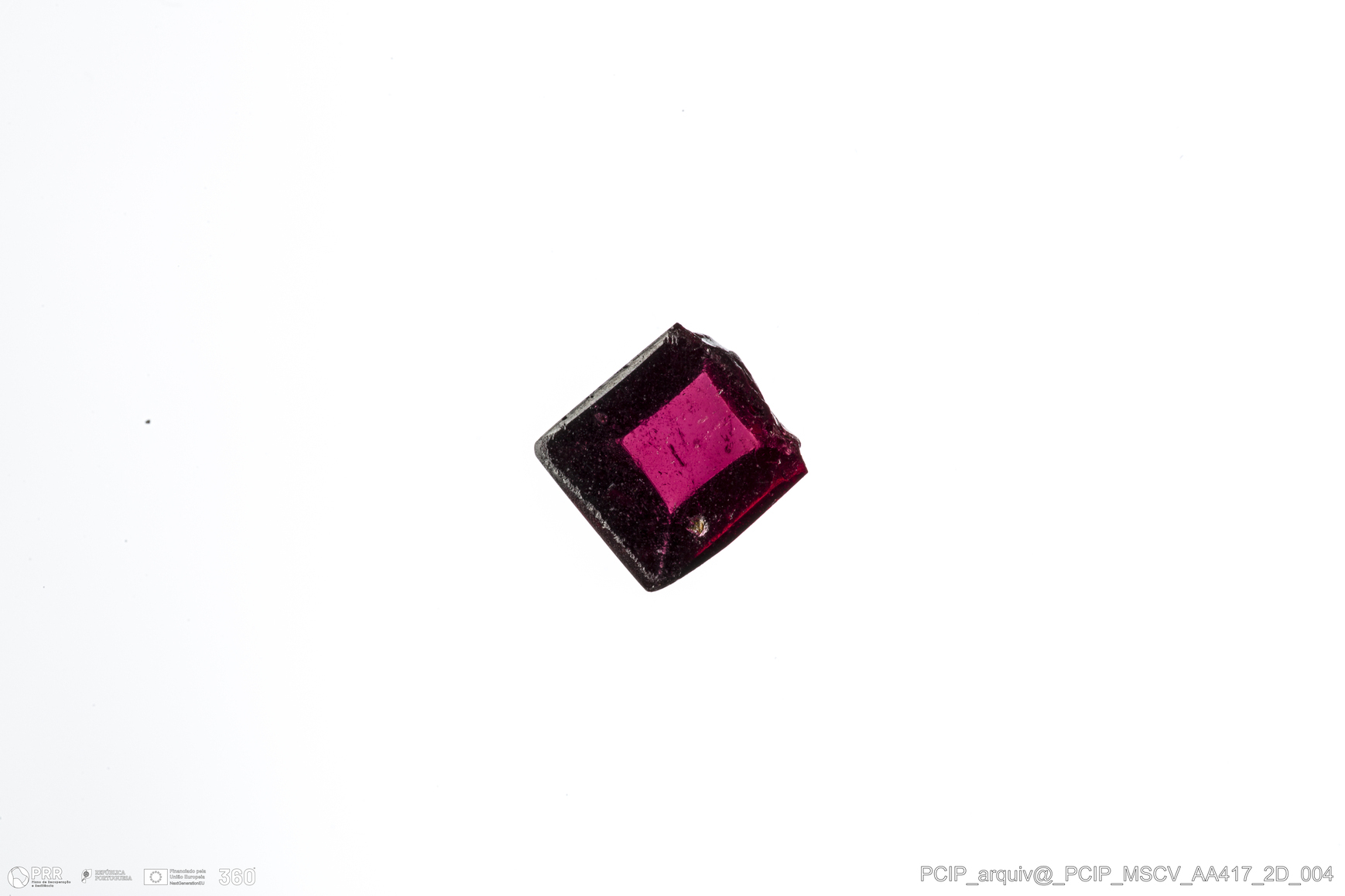Matéria/Técnica: pedra lapidada (?); Cronologia: Século XVI- XVII; Autoria: Desconhecida; Dimensões: Comprimento: 6mm; Largura: 6mm; Espessura: 3mm.