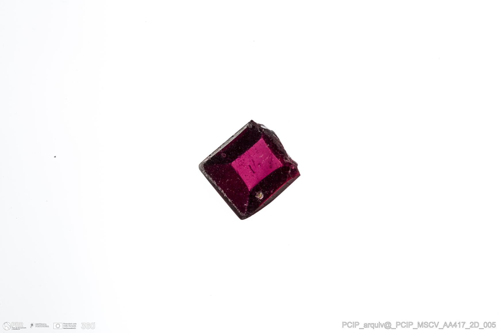 Matéria/Técnica: pedra lapidada (?); Cronologia: Século XVI- XVII; Autoria: Desconhecida; Dimensões: Comprimento: 6mm; Largura: 6mm; Espessura: 3mm.