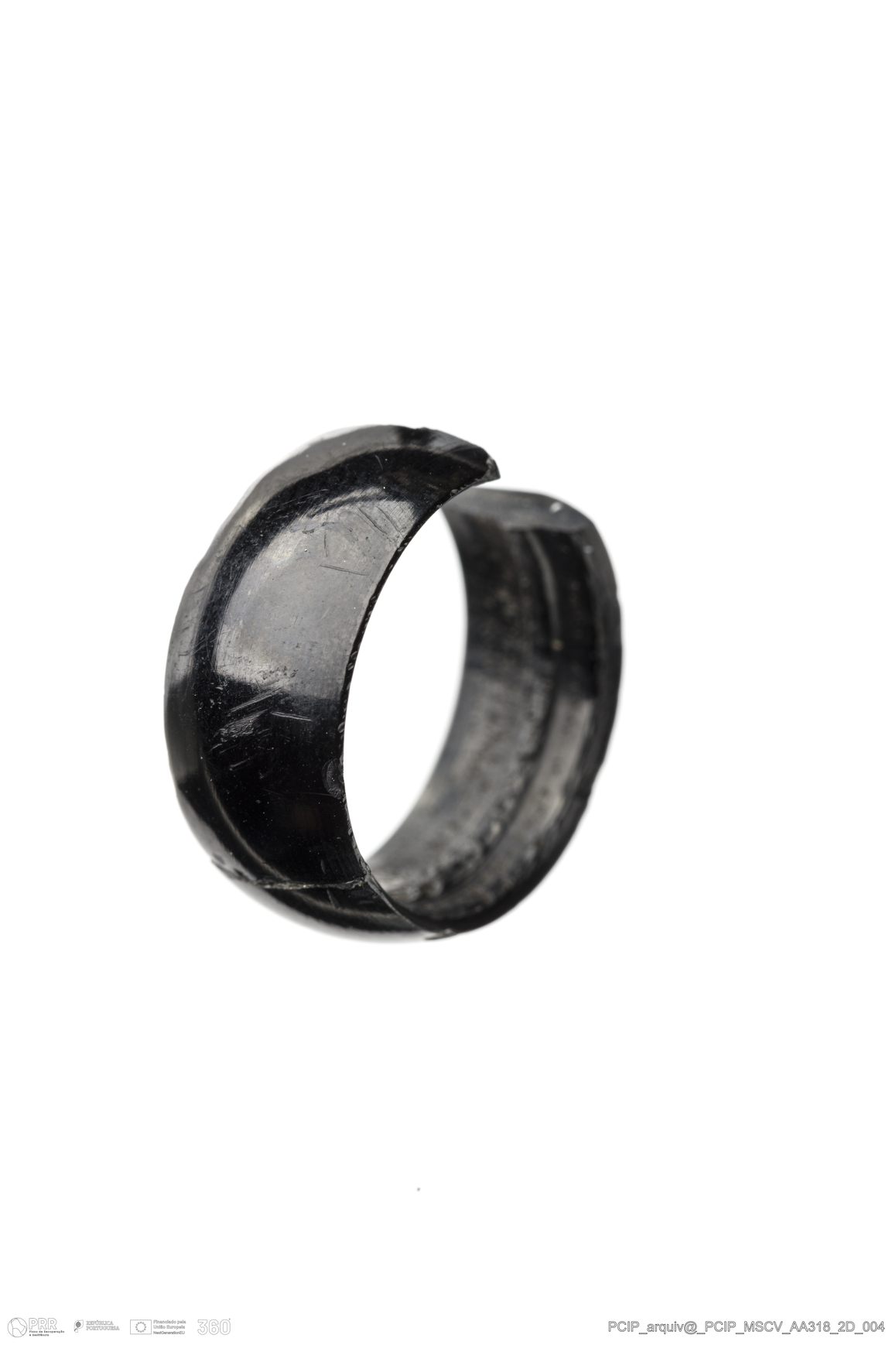 Matéria/Técnica: Azeviche; Cronologia: Século XVI- XVII; Autoria: Desconhecida; Dimensões: Diâmetro máximo: 19mm Altura máxima: 8mm Espessura máxima: 2mm.