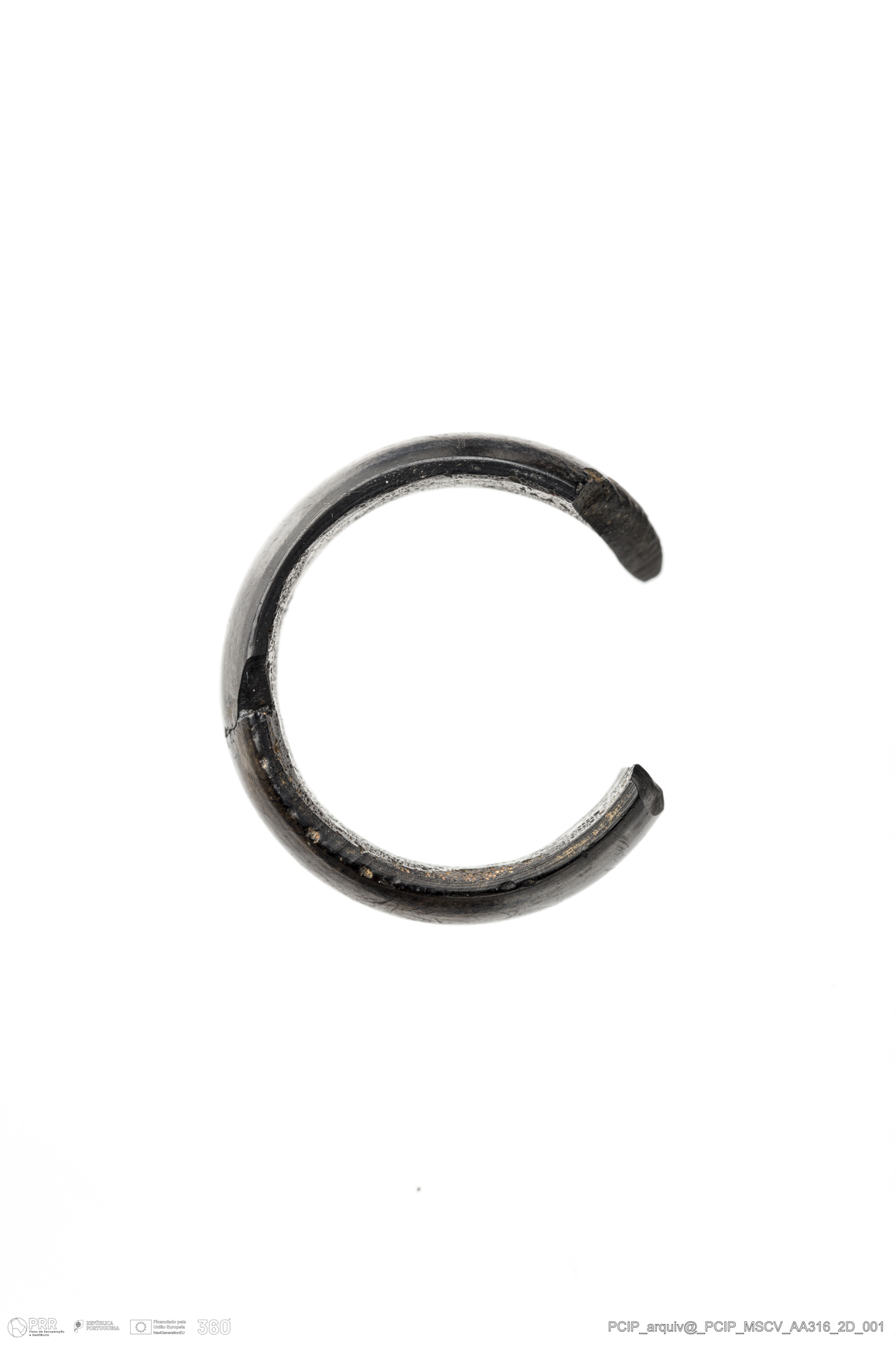 Matéria/Técnica: Azeviche; Cronologia: Século XVI- XVII; Autoria: Desconhecida; Dimensões: Altura máxima: 5mm Espessura máxima: 2mm.
