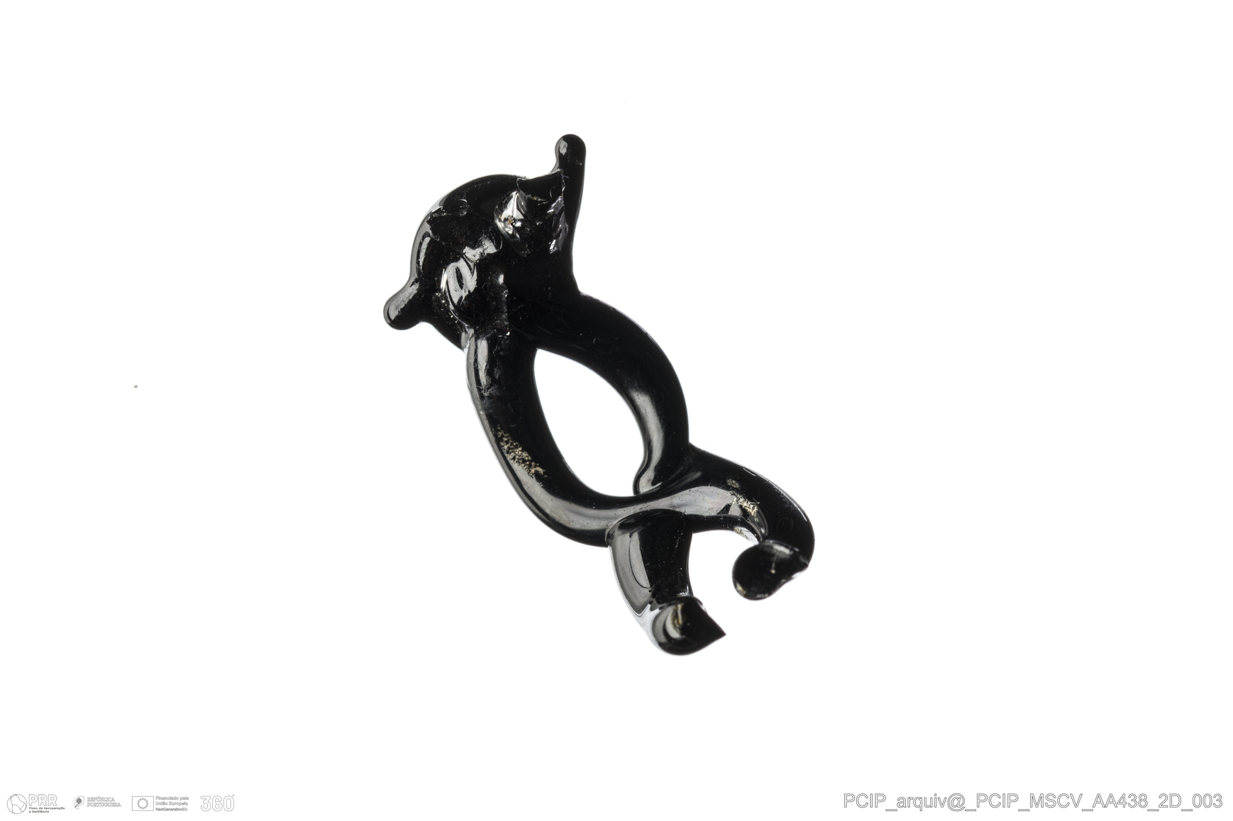 Matéria/Técnica: Vidro; Cronologia: Século XVI-XVII; Autoria: Desconhecida; Dimensões: Altura (coração): 12 mm; Diâmetro: 22 mm.