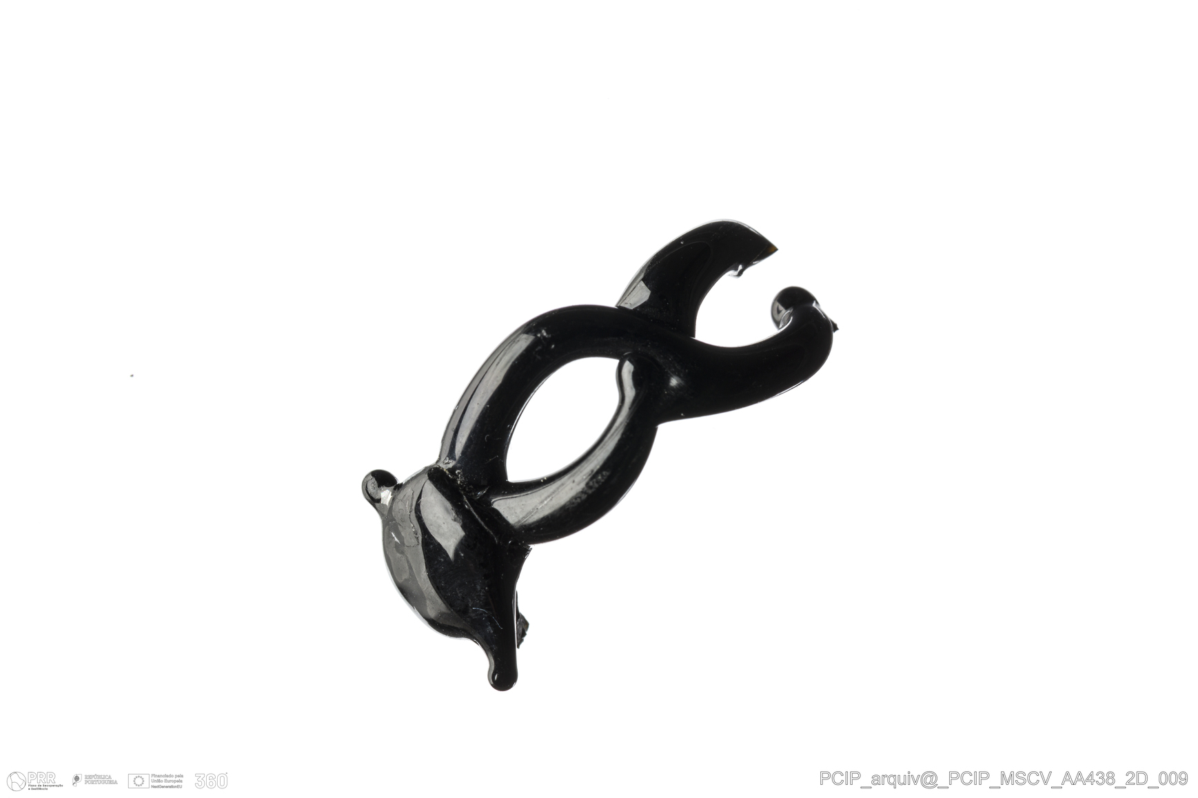 Matéria/Técnica: Vidro; Cronologia: Século XVI-XVII; Autoria: Desconhecida; Dimensões: Altura (coração): 12 mm; Diâmetro: 22 mm.