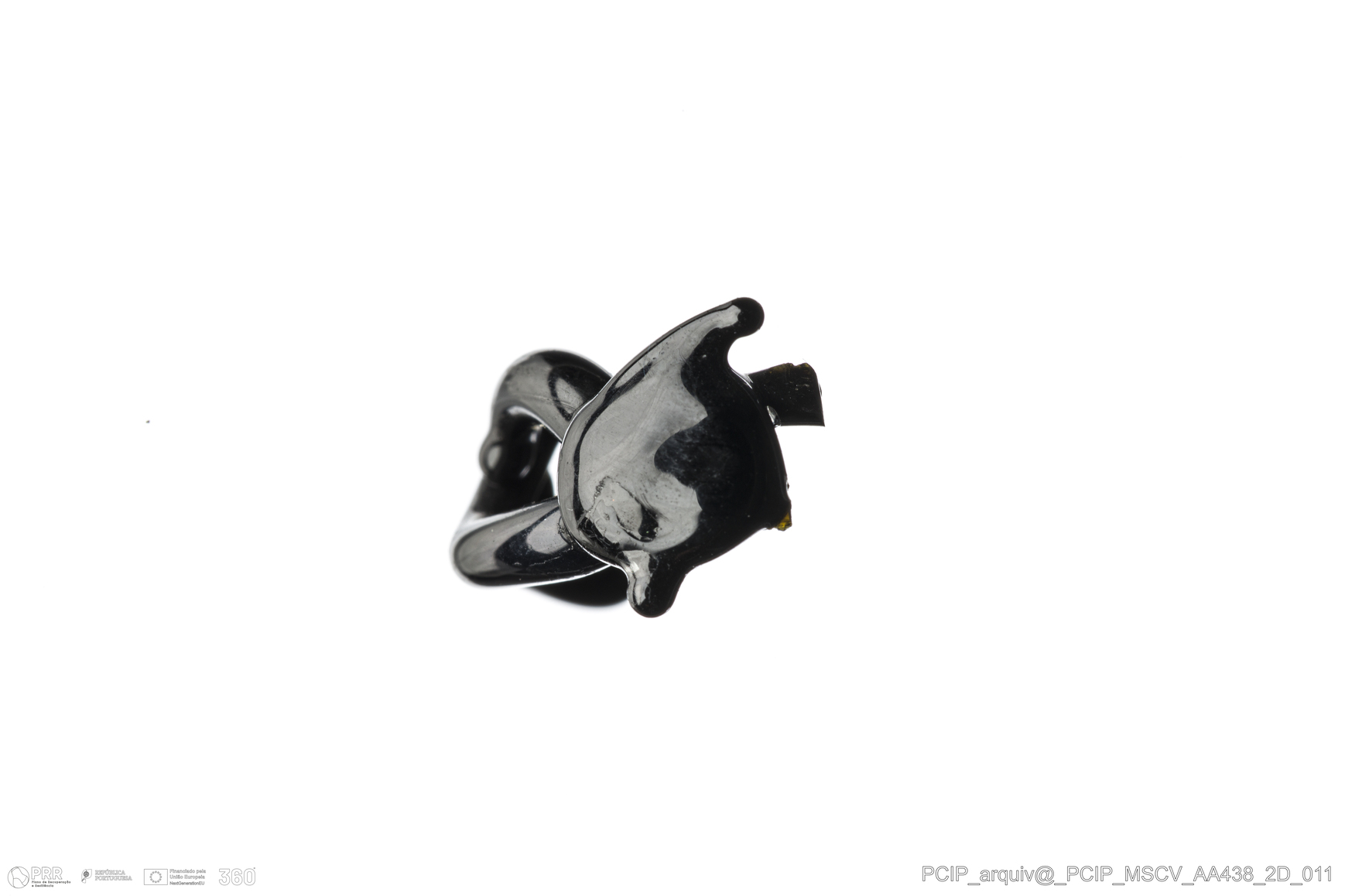 Matéria/Técnica: Vidro; Cronologia: Século XVI-XVII; Autoria: Desconhecida; Dimensões: Altura (coração): 12 mm; Diâmetro: 22 mm.
