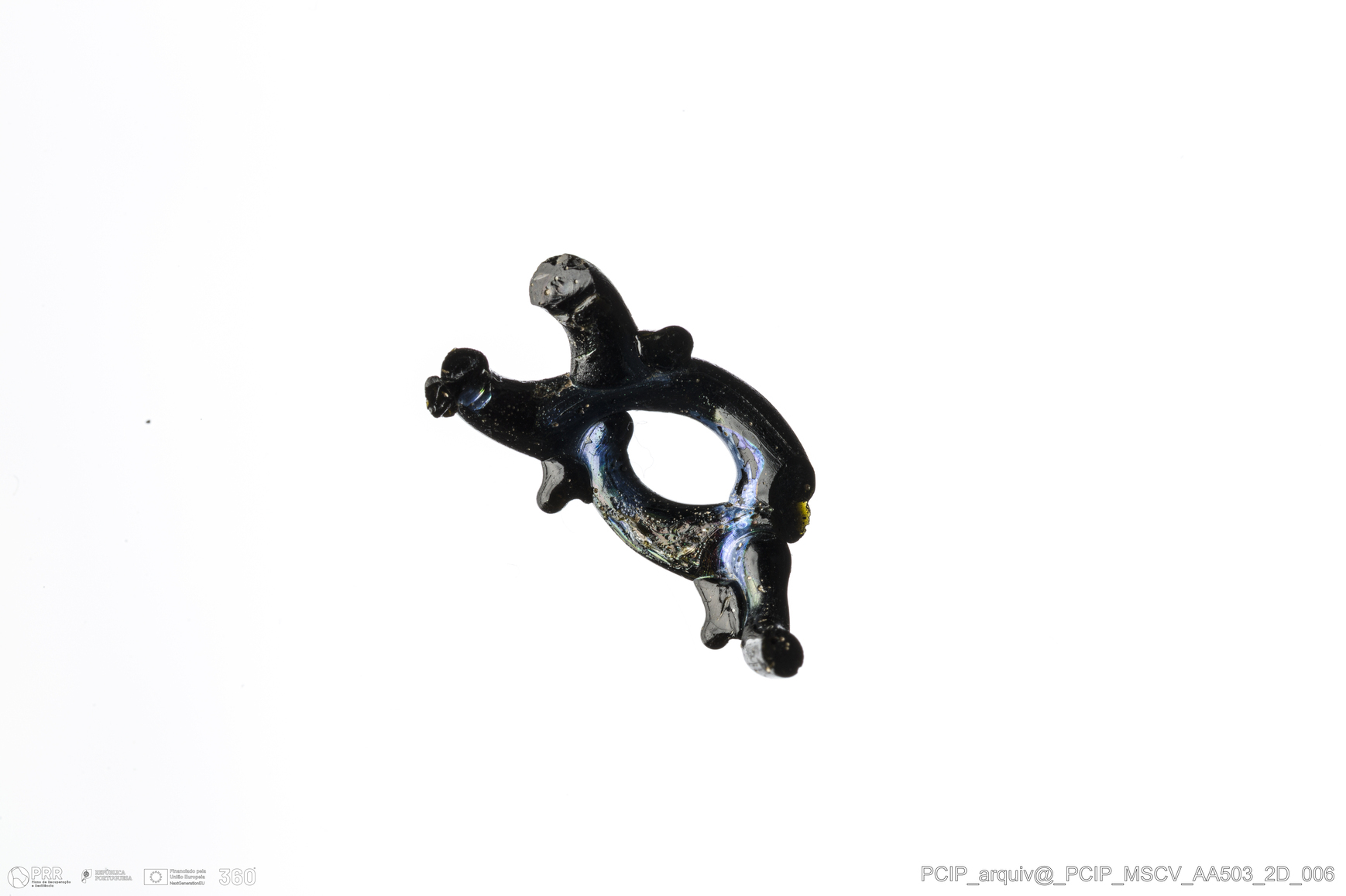 Matéria/Técnica: Vidro; Cronologia: Século XVI- XVII; Autoria: Desconhecida; Dimensões: Altura: 8mm; Espessura: 2mm.