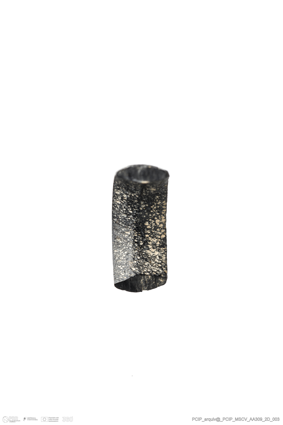 Matéria/Técnica: Azeviche; Cronologia: Século XVI-Século XVII; Autoria: Desconhecida; Dimensões: Comprimento: 7,5mm; Largura: 7mm; Altura: 6,5mm.