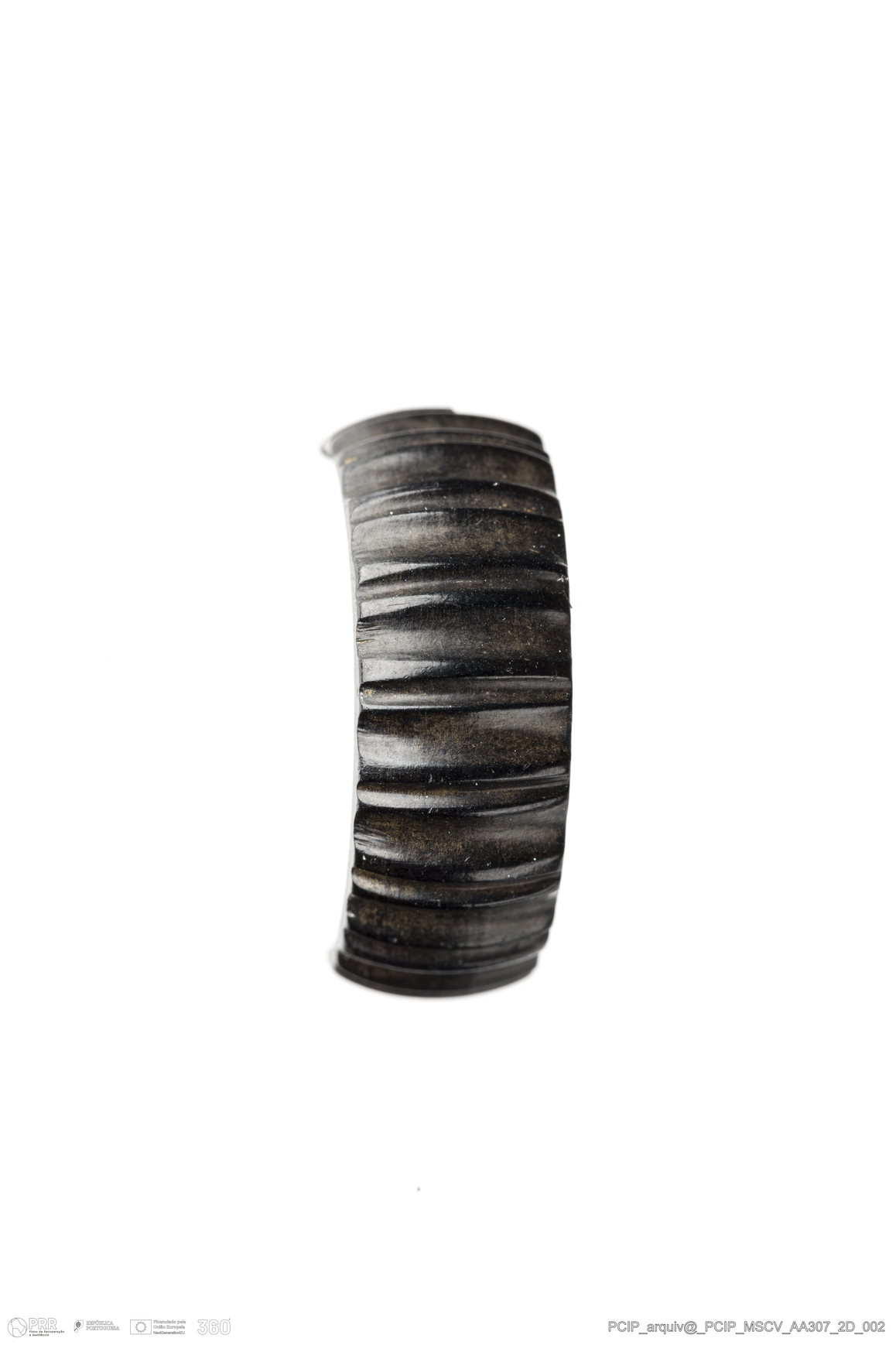 Matéria/Técnica: Azeviche; Cronologia: Século XVI-Século XVII; Autoria: Desconhecida; Dimensões: Diâmetro: 21,5mm; Altura: 8mm.