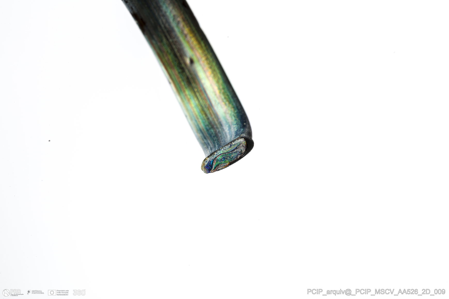 Matéria/Técnica: Vidro; Cronologia: Século XVI- XVII; Autoria: Desconhecida; Dimensões: Diâmetro máximo: 19mm; Altura: 5mm; Espessura: 1mm.