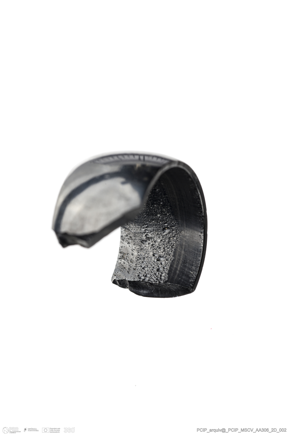 Matéria/Técnica: Azeviche; Cronologia: Século XVI-Século XVII; Autoria: Desconhecida; Dimensões: Diâmetro: 20mm; Altura: 11,5mm.