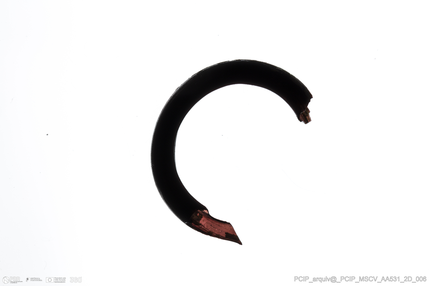 Matéria/Técnica: Vidro; Cronologia: Século XVI- XVII; Autoria: Desconhecida; Dimensões: Diâmetro máximo: 18mm; Altura: 3mm; Espessura: 3mm.