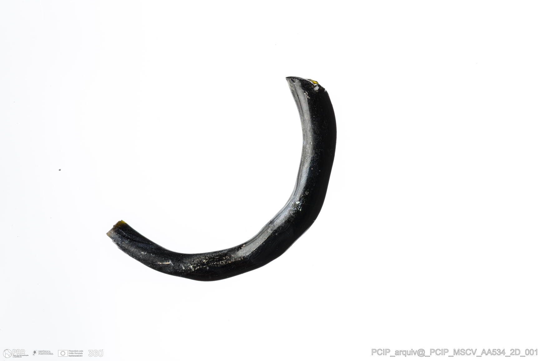 Matéria/Técnica: Vidro; Cronologia: Século XVI- XVII; Autoria: Desconhecida; Dimensões: Diâmetro máximo: 22mm; Altura: 3mm; Espessura: 3mm.