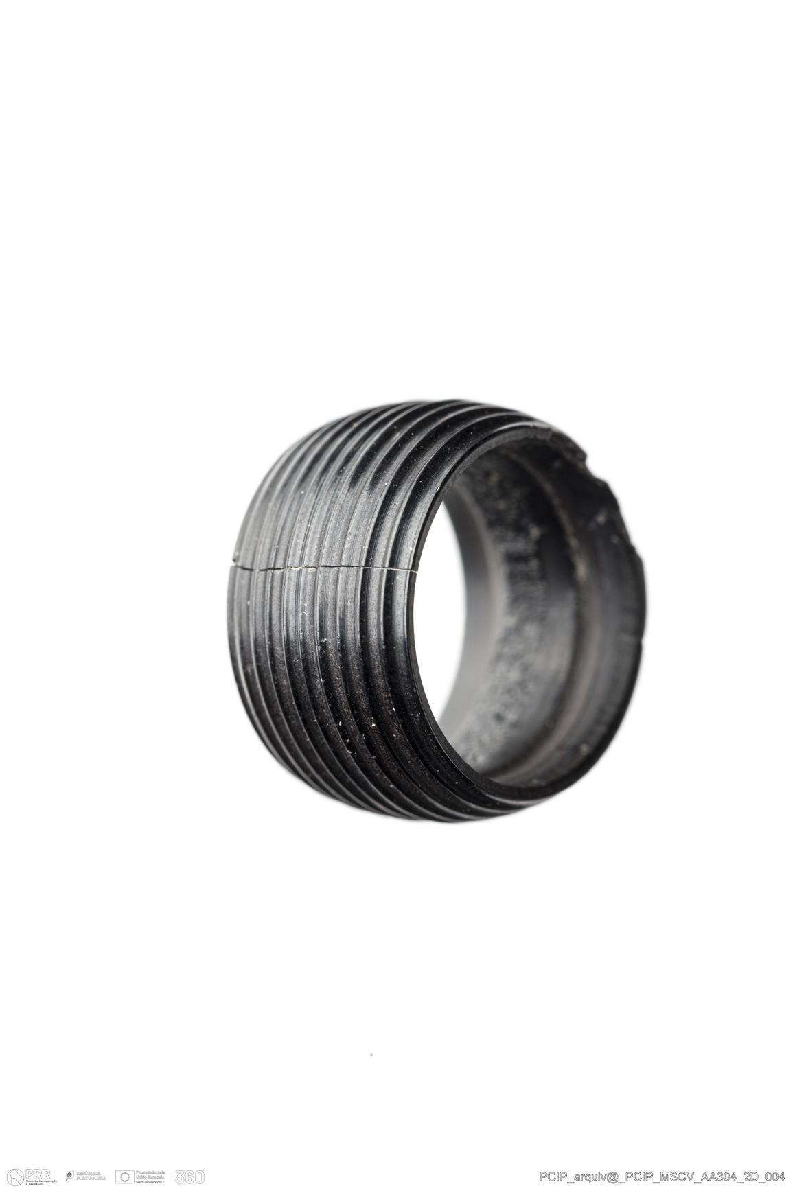 Matéria/Técnica: Azeviche; Cronologia: Século XVI-Século XVII; Autoria: Desconhecida; Dimensões: Diâmetro: 16,5mm; Altura: 9,5mm.