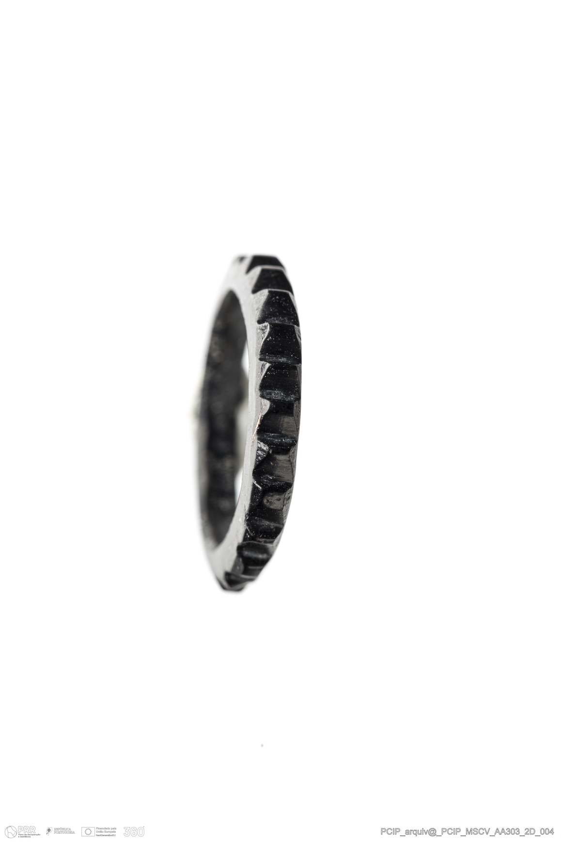 Matéria/Técnica: Azeviche; Cronologia: Século XVI-Século XVII; Autoria: Desconhecida; Dimensões: Diâmetro: 17,5mm; Altura: 2,5mm.