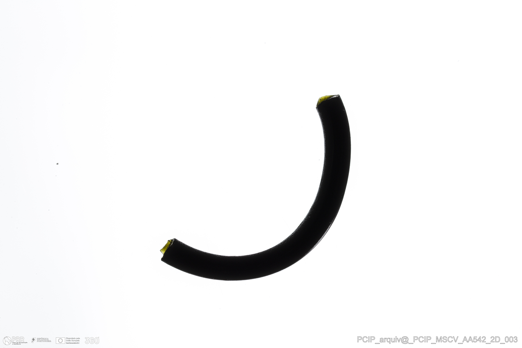 Matéria/Técnica: Vidro; Cronologia: Século XVI- XVII; Autoria: Desconhecida; Dimensões: Diâmetro máximo: 18mm; Altura: 1mm; Espessura: 1mm.
