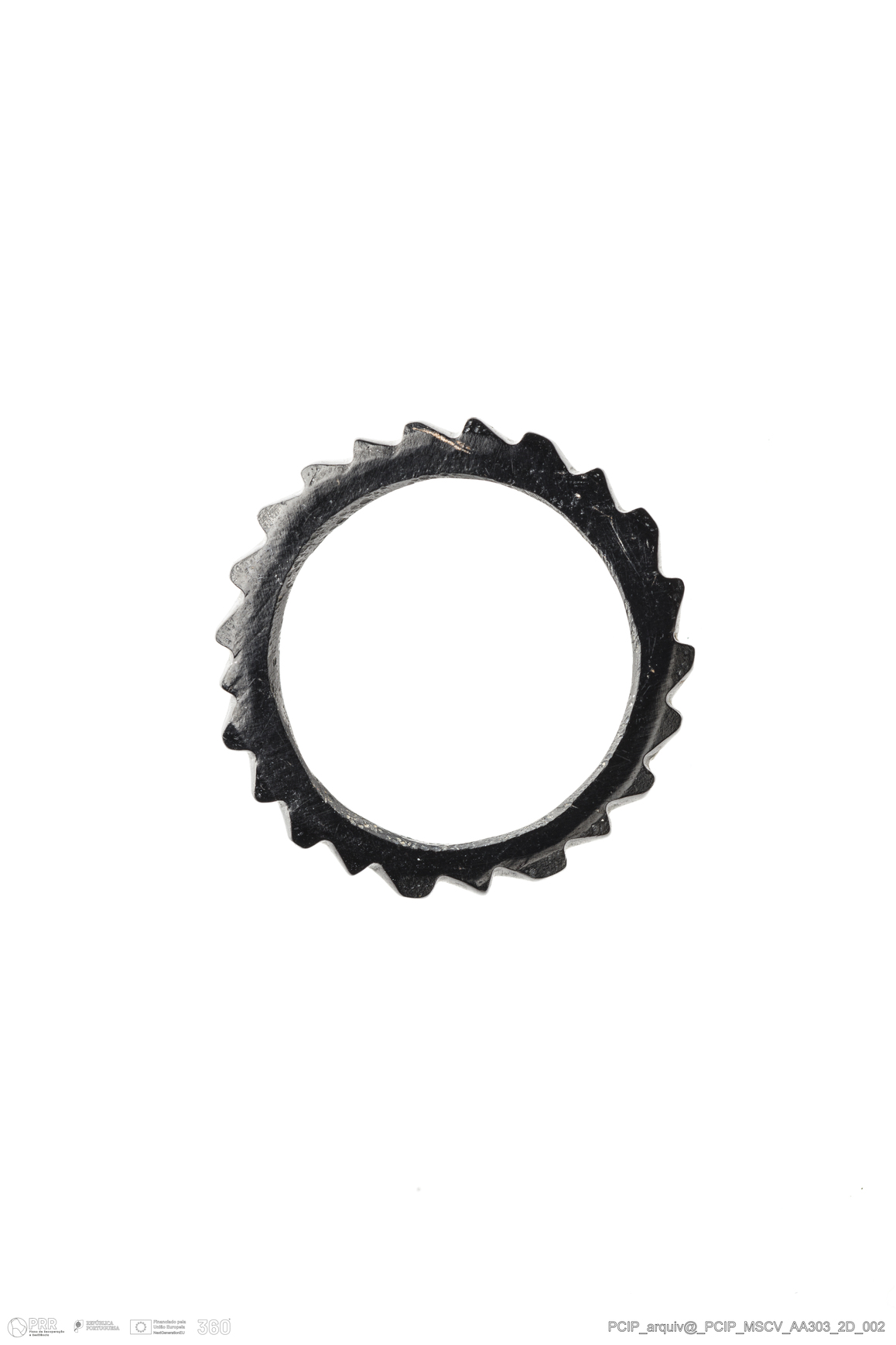 Matéria/Técnica: Azeviche; Cronologia: Século XVI-Século XVII; Autoria: Desconhecida; Dimensões: Diâmetro: 17,5mm; Altura: 2,5mm.