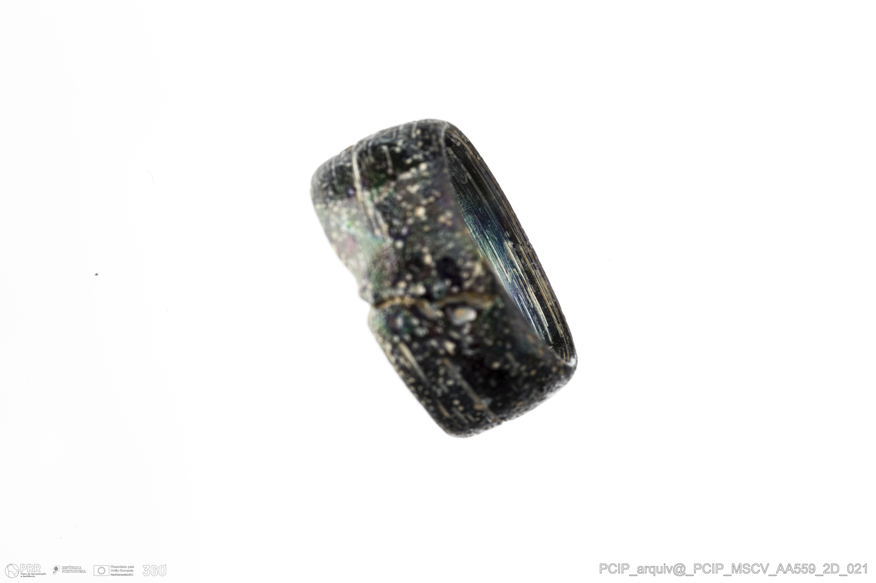 Matéria/Técnica: Vidro; Cronologia: Século XVI- XVII; Autoria: Desconhecida; Dimensões: Diâmetro máximo: 17mm; Altura: 8mm; Espessura: 2mm.