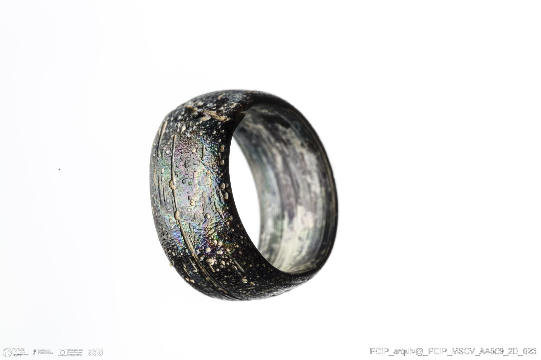 Matéria/Técnica: Vidro; Cronologia: Século XVI- XVII; Autoria: Desconhecida; Dimensões: Diâmetro máximo: 17mm; Altura: 8mm; Espessura: 2mm.