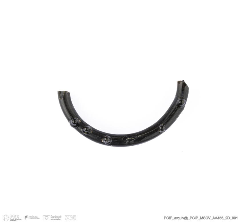 Matéria/Técnica: Vidro; Cronologia: Século XVI- XVII; Autoria: Desconhecida; Dimensões: Diâmetro máximo: 22mm; Altura: 4mm; Espessura: 3mm.