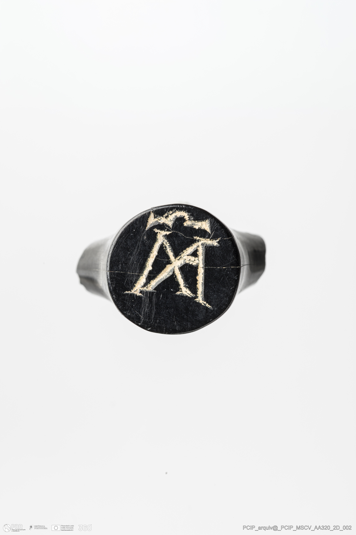 Matéria/Técnica: Azeviche; Cronologia: Século XVI-Século XVII; Autoria: Desconhecida; Dimensões: Remate: Diâmetro: 10,5mm; Espessura: 5mm.
