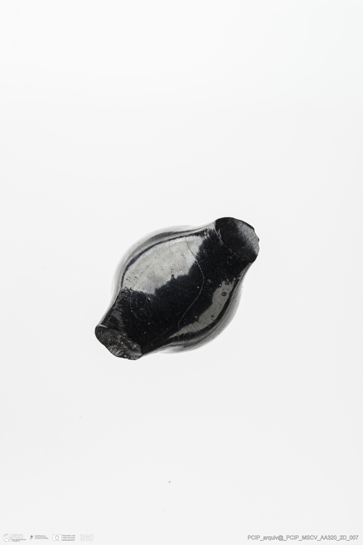 Matéria/Técnica: Azeviche; Cronologia: Século XVI-Século XVII; Autoria: Desconhecida; Dimensões: Remate: Diâmetro: 10,5mm; Espessura: 5mm.