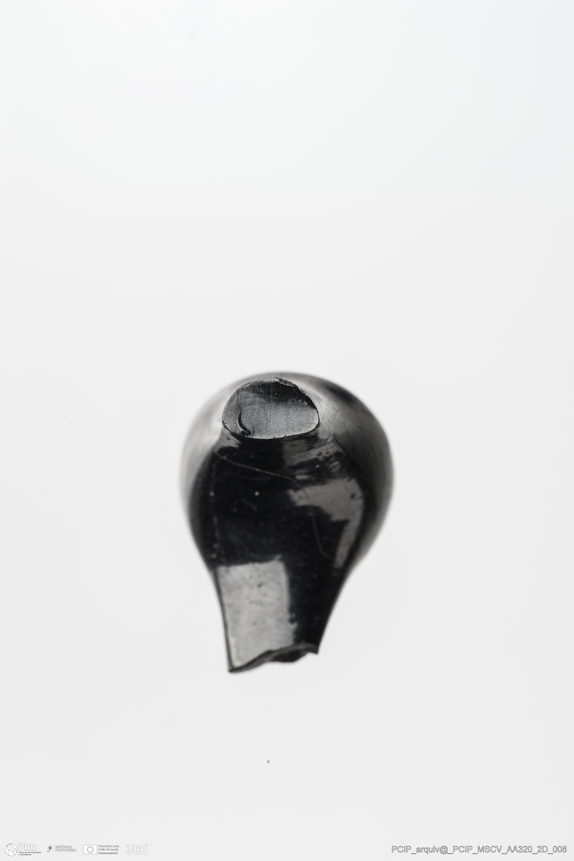 Matéria/Técnica: Azeviche; Cronologia: Século XVI-Século XVII; Autoria: Desconhecida; Dimensões: Remate: Diâmetro: 10,5mm; Espessura: 5mm.
