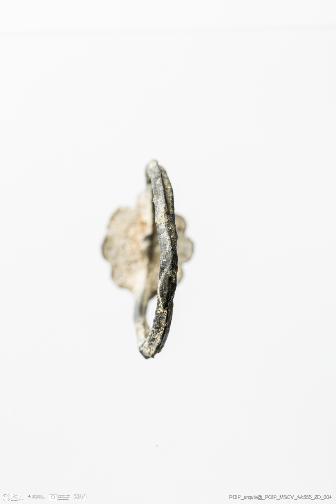 Matéria/Técnica: Metal; Cronologia: Século XVI- XVII; Autoria: Desconhecida; Dimensões: Diâmetro máximo: 22mm; Altura: 11mm; Espessura: 4mm.